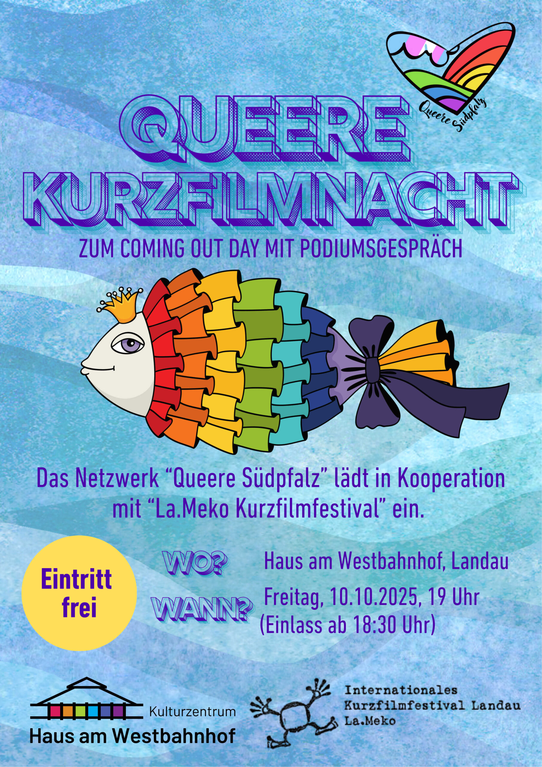 Rund um den internationalen Coming Out Day am Samstag, 11. Oktober, finden weltweit Veranstaltungen statt, die queeres Leben sichtbar machen und für mehr Akzeptanz und Gleichberechtigung werben. Auch in Landau wird in diesem Jahr wieder ein besonderes Zeichen gesetzt. Das Netzwerk Queere Südpfalz, in dem sich unterschiedliche lokal engagierte Gruppen, Einzelpersonen sowie Institutionen zusammengeschlossen haben, lädt in Kooperation mit dem La.Meko Filmfestival am Freitag, 10. Oktober, zu einer queeren Kurzfilmnacht ein. Die Veranstaltung findet im Haus am Westbahnhof statt und beginnt um 19 Uhr. Einlass ist bereits ab 18.30 Uhr.